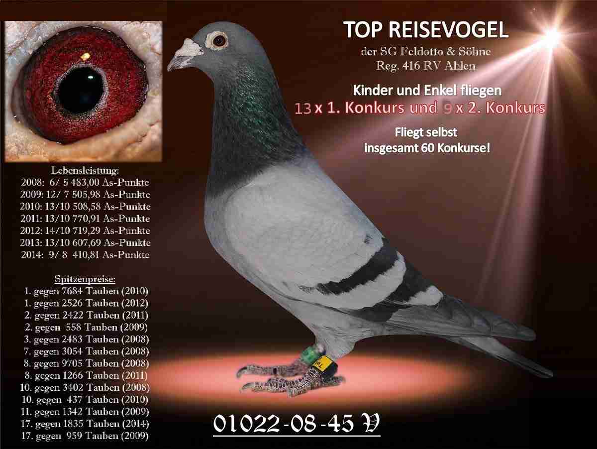 - Bei Sascha Manske in Oberhausen fliegt eine Nachzuchttaube den 1. Preis auf einem Jungflug. Ein Originaler von Feldotto aus der „Anton“-Dynastie ist Miterringer der 1.RV Meisterschaft 2017. Ein weiterer Originaler des Schlages wird 2016 3. bester jähriger Vogel der RV Oberhausen Zentral mit 11 Preisen.