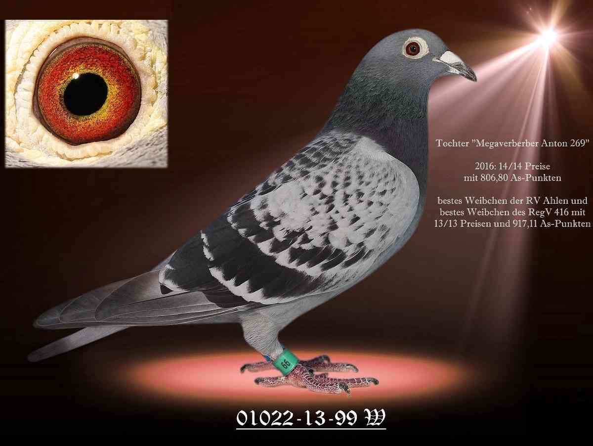 Die Tochter des „ANTON 269“ 01022-13-99 flog 2016 14 x gesetzt 14 x Preis und wurde bestes Weibchen im RegV 416 und in der Reisevereinigung Ahlen