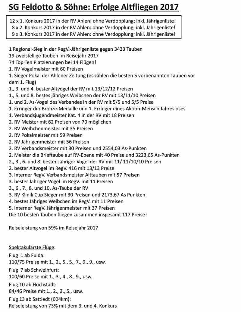 Seit Jahren gibt es nur Superlative der SG Feldotto aus dem westfälischen Ahlen zu hören. Es ist für die Konkurrenz seit Jahren schwer, es mit dieser „taubensportverrückten“ Familie aufzunehmen. Im Reisejahr 2017 waren es nunmehr 12 1. Preise welche die Leistungsstärke des Schlages dokumentieren.
