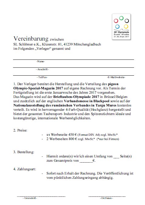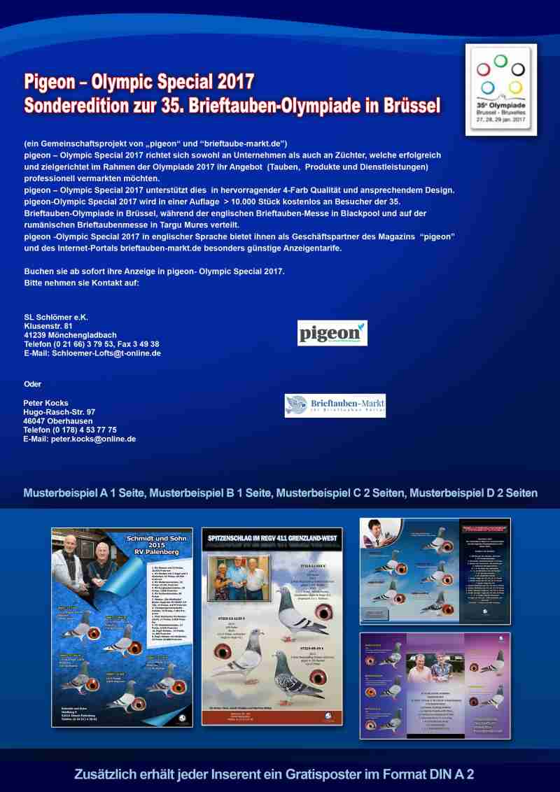 Pigeon – Olympic Special 2017 bietet ihnen als Geschäftspartner des Magazins“ pigeon“ und des Internet-Portals brieftauben-markt.de besonders günstige Anzeigentarife.
