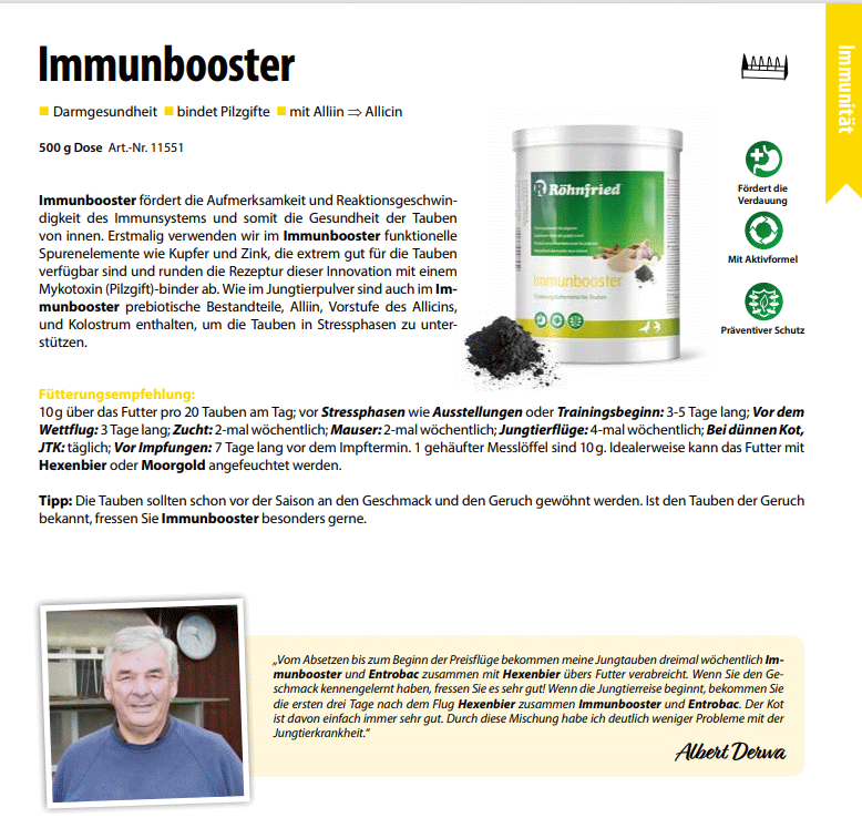 In der Brieftaubenhaltung hat sich eine Kombination der BetaGlucane mit einer Mischung aus funktionellen Aromen bewährt. Eins davon ist das oft beschriebene Allicin, der aktive Wirkstoff des Knoblauchs, der aus der Vorstufe Alliin mithilfe des Enzyms Allinase gebildet wird. Leider ist Allicin nicht lange stabil und zerfällt z. B. in Flüssigkeiten wie dem Trinkwasser bei Raumtemperatur schon nach kurzer Zeit und ist dann unwirksam. Aufgrund dessen hat sich die technologische Behandlung des Knoblauchs mittels der Gefriertrocknung bewährt, da somit das stabile Alliin erhalten bleibt. Das nach der Fütterung aus dem Alliin gebildete Allicin wirkt dann im Zusammenspiel mit Zimt stark bakterizid gegen E. Coli und Salmonellen, schont aber gleichzeitig die positive Darmflora wie z. B. Laktobazillen. Für ein starkes Immunsystem setzen wir ferner auf die Fütterung von darmaktiver Pulvercellulose, die für eine Verlängerung der Darmzotten und damit für eine Vergrößerung des Darms und des gesamten Immunsystems sorgt.