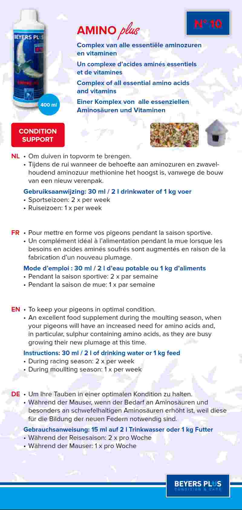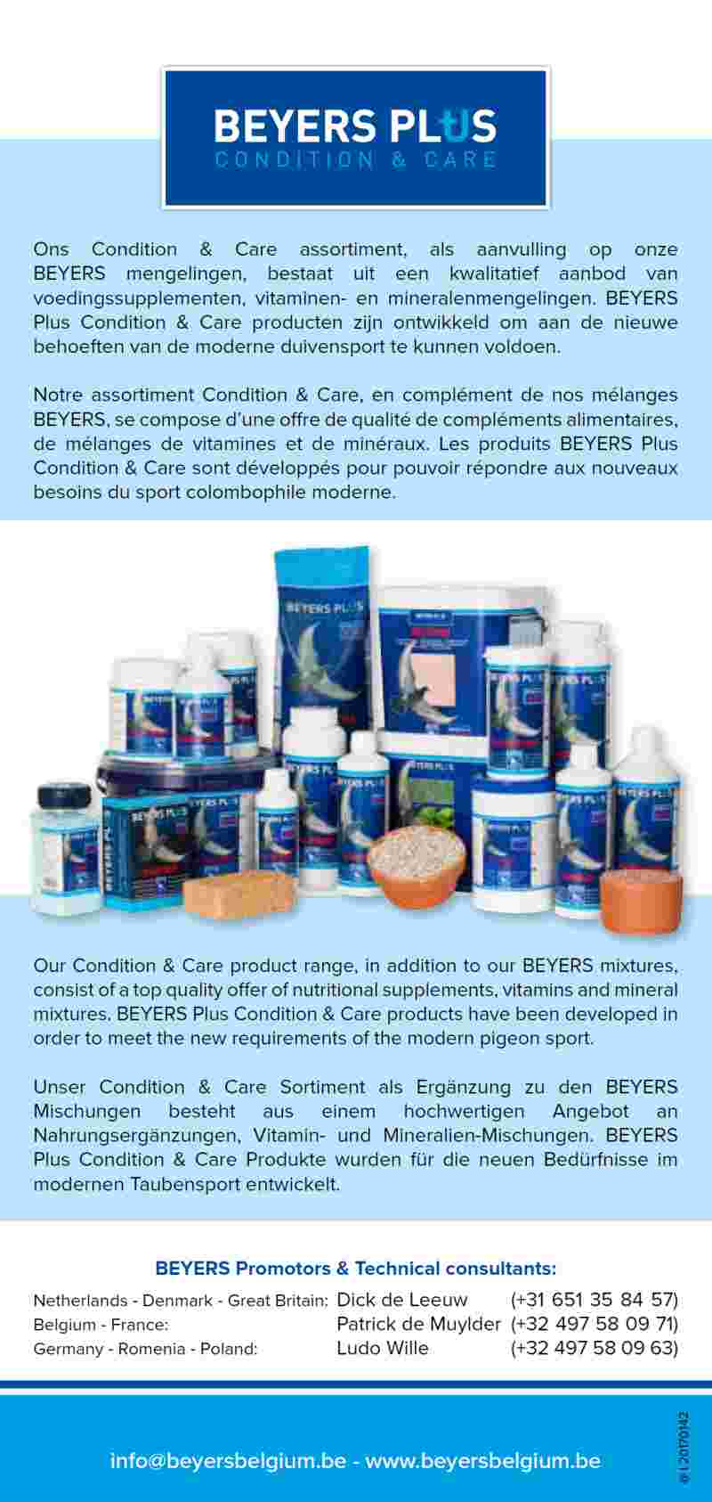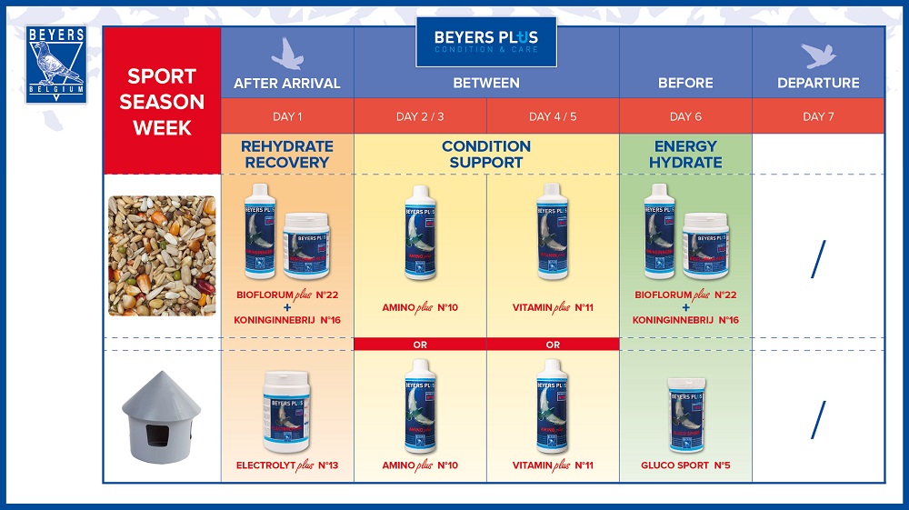 BEYERS Plus Condition & Care Produkte wurden für die neuen Bedürfnisse im modernen Taubensport entwickelt. Die Belastungen werden immer intensiver, die Tauben werden auf größeren Entfernungen und öfter eingesetzt und haben so kürzere Ruhepausen.