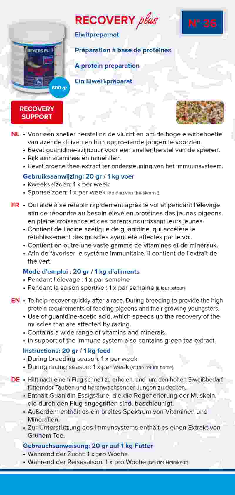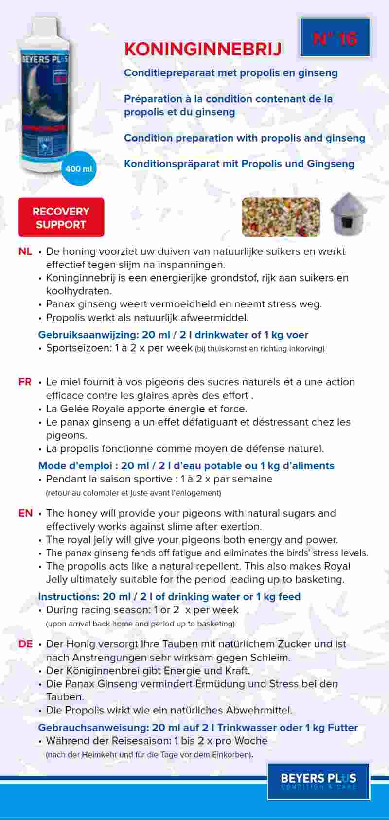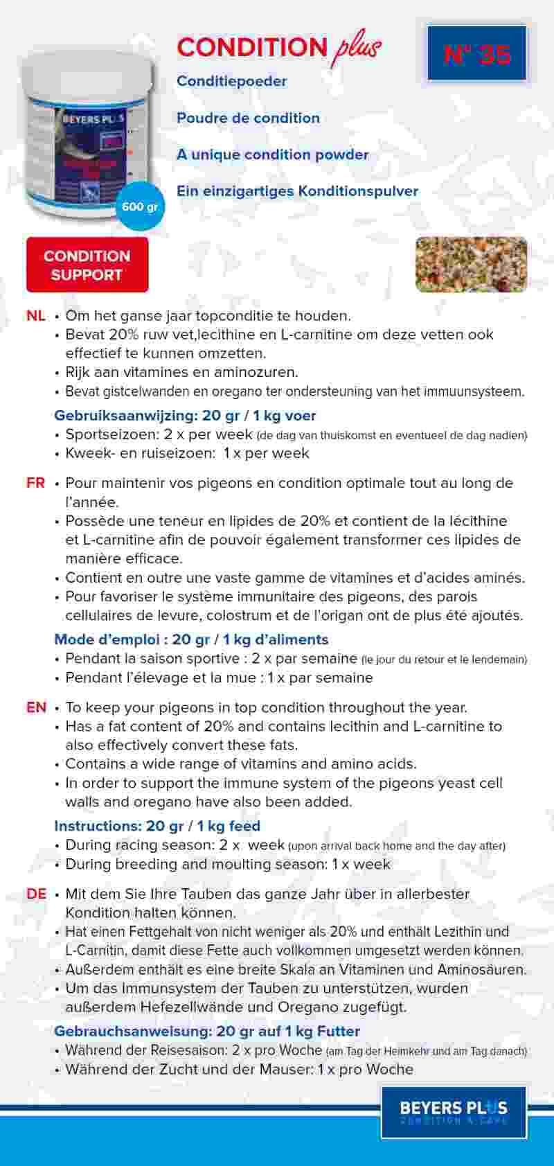 BEYERS Plus Condition & Care Produkte wurden für die neuen Bedürfnisse im modernen Taubensport entwickelt. Die Belastungen werden immer intensiver, die Tauben werden auf größeren Entfernungen und öfter eingesetzt und haben so kürzere Ruhepausen.