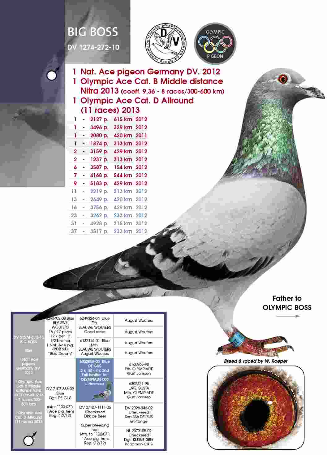 So beweist es aktuell der bei Wolfgang Röper gezüchtete Vogel 01274-10-272 „BIG BOSS“ der selbst im Jahr 2012 nicht nur 1. Nationale AS-Taube in Deutschland sondern auch im Jahr 2013 sowohl 1. Olympiade Taube Mittelstrecke als auch 1. Olympiade Taube Allround wurde. Eine einmalige Leistung !