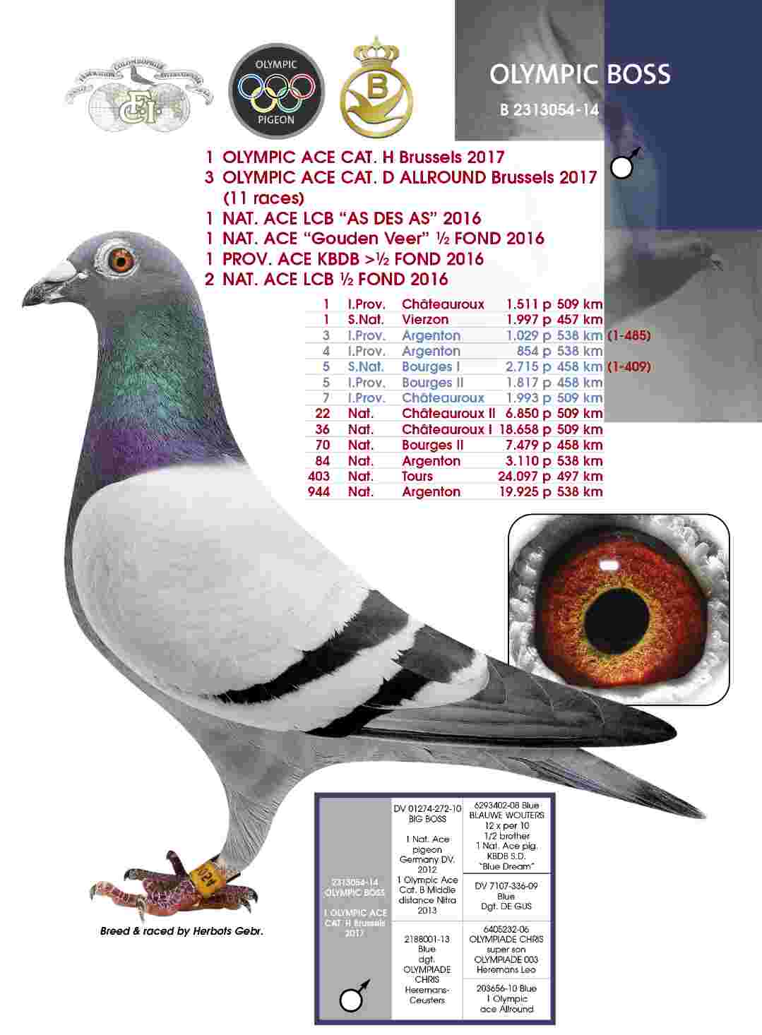 „ Als Jungtaube waren seine Erfolge nicht der Rede wert. Er kam erst ins Gespräch als er von dem total verkrachten Flug ab Gueret 2014 nicht nach Hause kam. Auf diesem Flug blieben ganze Schläge leer. Einige Tage später wurde „Olympic Boss“ nicht mehr als 3 km von seinem Heimatschlag in Halle-Booienhoven entfernt auf einer Schweinefarm gefunden und gemeldet. Er war total abgeflogen und dünn wie ein Brett. Er bekam jedoch seine Chance und regenerierte extrem schnell. Dies war sicherlich ein gutes Zeichen. Er mauserte gut und bekam als Jähriger seine zweite Chance. Er überzeugte auf ganzer Linie und durch seine eindrucksvollen Ergebnisse wurde er Olympiade-Taube.“, berichtet Jo Herbots von der ungewöhnlichen Lebensgeschichte des „OLYMPIC BOSS“.