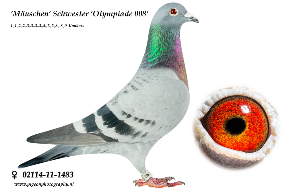 Mutter der „OLYMPIADE 008“ ist eine „Tochter EURO“ NL 09-1835099. Dieses Weibchen wurde aus zwei Originaltauben von Leo Heremans bei der Fam. Eijerkamp gezüchtet. Ihr Vater ist der „EURO“, B 03-6192564 der 1. Westeuropäische AS-Taube war. Die Mutter der „Tochter Euro“ ist die „FINETTE“ B 06-6148335, ebenfalls von Leo Heremans. Die „FINETTE“ war selbst Olympiade-Taube in Dortmund 2009.