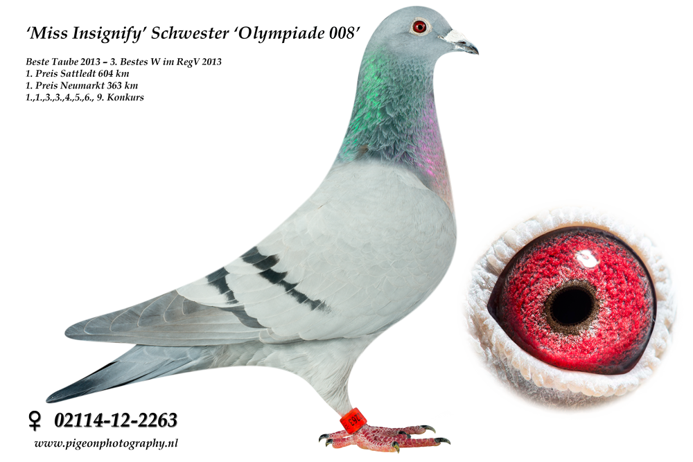 02114-12-2263 „Miss Insignify“ – Tochter „Wonderpair“ 2013 beste RV-Taube und 3. bestes Weibchen im RegV mit dem 1., 1., 3., 3., 4., 5., 6., 9. Preise.