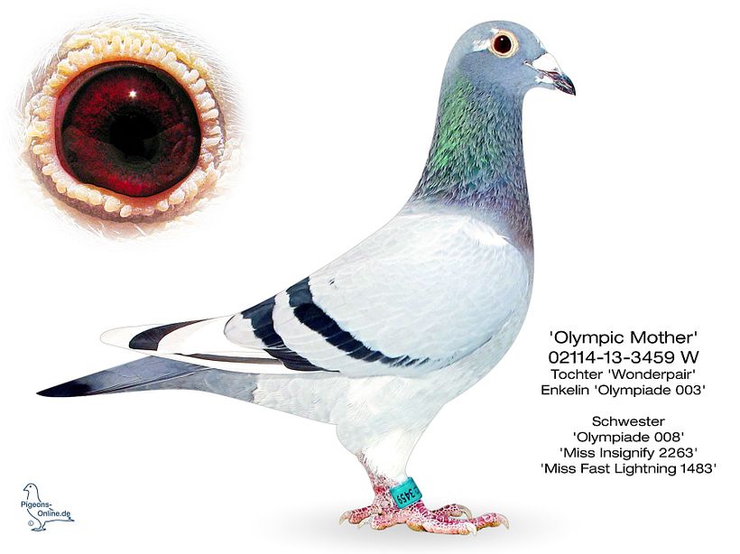 „OLYMPIC MARTIN“ stammt mütterlicherseits aus einer Schwester „OLYMPIADE 008“ und somit wieder aus der Linie des Wunderpaares bei Schlief-Stiens. Vater des „OLYMPIC MARTIN ist der „OLYMPIC FATHER“ B-12-6324937, ebenfalls orig. Leo Heremans. „OLYMPIC FATHER“ ist ein Sohn des „KLEINE BLAUWE“- 12. nat. AS-Taube KBDB 2011 mit u.a. 1., 1., 1., 1., 2.., 3., 4., 5. Preis. Der Vater des „KLEINE BLAUWE“ ist der „SURPRISE“, ein Sohn des „SAFIER“, der u.a. 3x 1. Preis fliegt und auch wieder ein Sohn des „Olympiade 003“ ist. Die Mutter des „KLEINE BLAUWE“ ist eine Schwester der „NATALIA“ – 1. As-Taube kleine Fond Jährige Union Antwerpen 2004 und 10. Nat. AS-Taube große Halve Fond KBDB 2005. Die Mutter des „Olympic Father“ stammt aus der Verpaarung „ROSSI“ x „SPINNEKE„ – ebenfalls Tochter des „OLYMPIADE 003“.