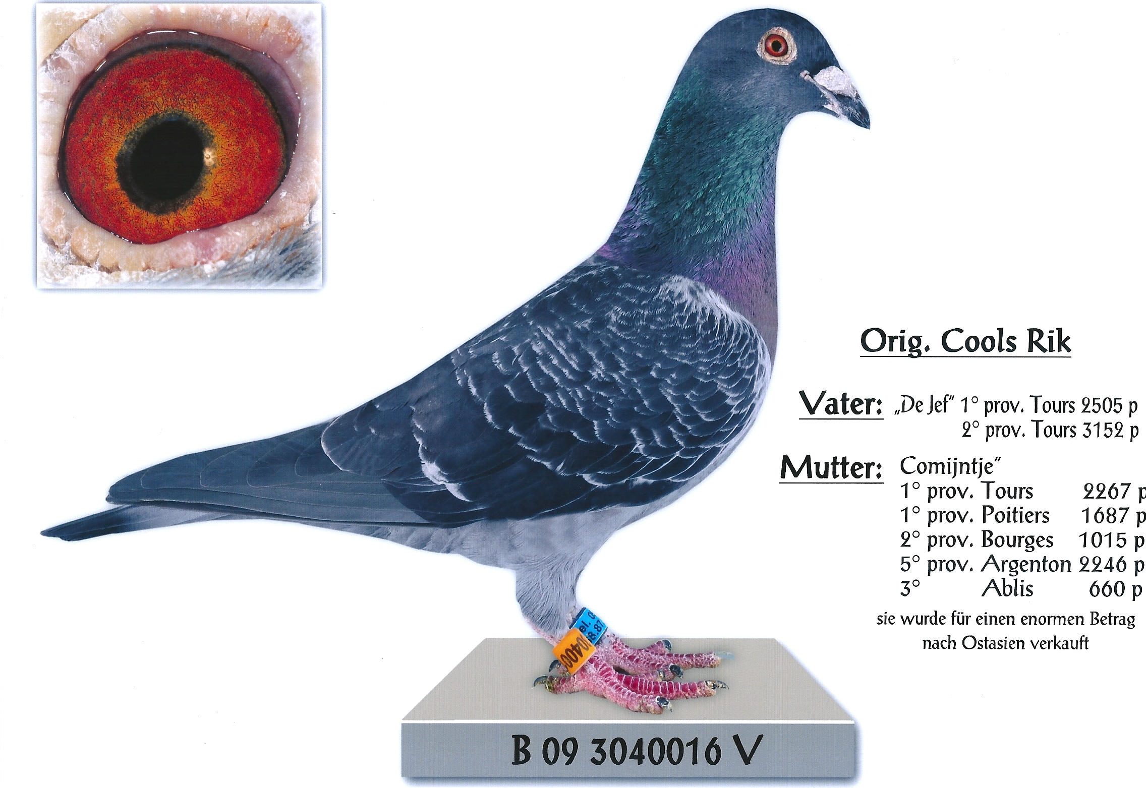 Der Vater der „FENOMEEN“ ist ein Original-Vogel von Rik Cools, dessen Eltern selbst 3 x den 1. Preis provinzial und 2 x den 2. Preis ebenfalls provinzial flogen. Die Mutter der „FENOMEEN“ ist eine Tochter des „SAFIER“-Paares von Leo Heremans, das für 270.000 Euro nach China verkauft wurde.
