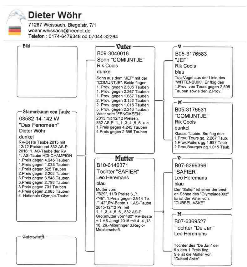 Der Sieger beim Endflug in Sun-City 2014 vom leider verstorbenen Karl Ziefle, wurde aus einer Original-Taube von Dieter Wöhr gezüchtet. Die Mutter kommt aus einem Sohn des „DI CAPRIO“ der mit einer Tochter des AS-Vogel „777“, einem Sohn des Top-Vererber „244“, verpaart war.