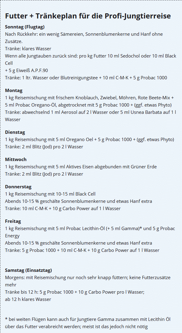 - ab Anfang Mai keine weiteren Jungtiere mehr zu den Reisetauben setzen;