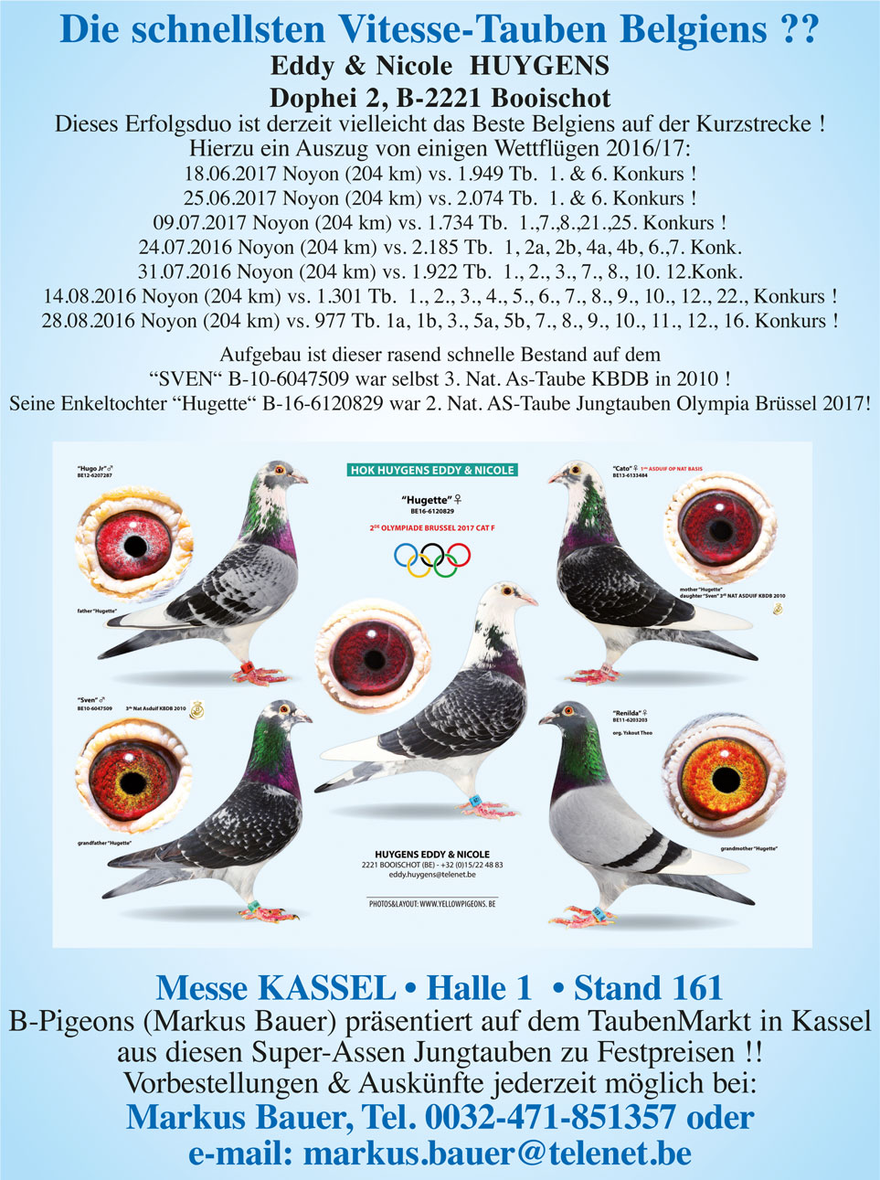 Das komplexe Gebiet der Gesundheit für die Tauben möchte ich in meinem Grußwort auch nicht unerwähnt lassen. Taubentierärzte sind ebenso präsent wie die auf Brieftaubenprodukte spezialisierte Pharma-Industrie. Und an beiden Messetagen werden wieder hochkarätige Versteigerungen und vor dem versammelten Publikum mehrere Siegerehrungen beliebter Brieftauben-Meisterschaften stattfinden. Hinzu kommen die vielen Käfige mit Tauben und anderen Vögeln, die Tribünenflug-Werbestände usw. Bei letzteren möchte ich einen Augenblick verweilen. Wie Ihnen als Leser von TaubenMarkt/Die Sporttaube wahrscheinlich nicht entgangen ist, veröffentlichen wir seit Jahren jeweils in der Ausgabe Januar eine Kurzvorstellung der Tribünenflüge, der sog. One Loft Races, des neuen Jahres. Natürlicherweise sind das die Tribünenflüge, die auf dem Int. TaubenMarkt einen Werbestand betreiben. Im Vorwort zu dieser Veröffentlichung heißt es u. a.: “Denn das persönliche Gespräch, ein Eindruck, mit wem man es zu tun hat, wem man seine wertvollen Jungtauben gegen Teilnahmegebühr in die Hände gibt, das kann keine Internetkommunikation, kein Handy, iPhone, Smart-Phone, iPad, Laptop oder wie sie alle heißen mögen ersetzen! Eine Teilnahme am Int. TaubenMarkt Kassel kann für beide Seiten mehr als nur förderlich sein – sie lohnt sich! Also, liebe Tribünenflugveranstalter und “One Loft Race Organizer”, die Ihr diesen Text lest, sichert Euch rechtzeitig einen Informationsstand beim 28. Int. TaubenMarkt am 28. und 29. Oktober 2017 in Kassel!” Dieser Aufruf verklang nicht ungehört, denn auch die Anzahl dieser Werbestände ist wieder gestiegen.