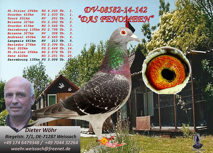 Im Jahr 2016 war das Weibchen „FENOMEEN„ die Königin des Reisegeschehens. Aus Ausnahmevererbern wieder Ausnahmetauben züchten“, so beschreibt Dieter Wöhr seinen erfolgreichen Zuchtweg. Es ist ihm bereits bei sehr vielen Tauben gelungen. Besonders eindrucksvoll hinterlässt das AS-Weibchen 08582-14-142 „FENOMEEN“ diese züchterischen Erfolgsspuren.
