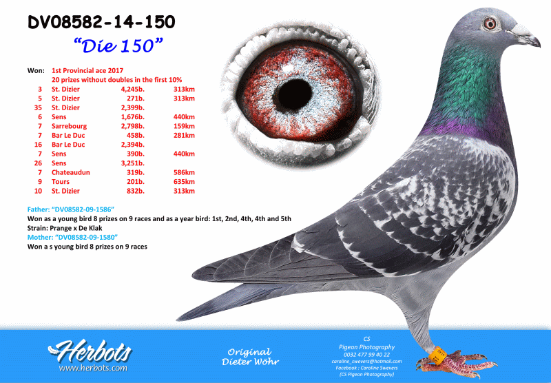 Da ist die 08582-14-150. Sie wird 1. AS-Weibchen im Regionalverband. Bereits 2016 fliegt sie von 12 Einsätzen 10 Preise und 2017 dann von 13 Einsätzen 11 Preise. Ihr Vater ist der 08582-09-1586 aus dem 02098-08-248, einem Enkel des „Ringlosen“ von Günter Prange mit einer De-Klak-Täubin, die zahlreiche Spitzentauben gebracht hat. Mutter der „150“ ist eine Enkelin des besagten „244“, den Dieter Wöhr als Ei von Gaby Vandenabeele bekommen hat.