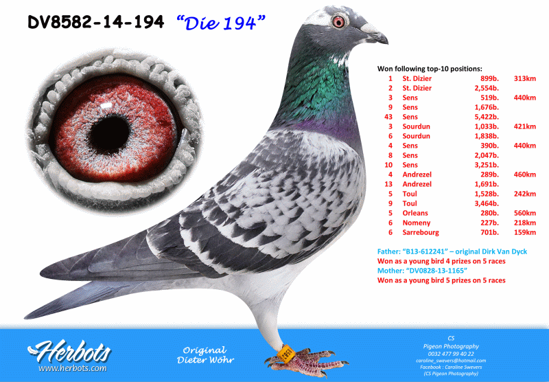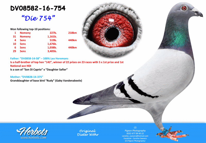 Der weitere Stammvogel wurde der „753“ von den Gebr. Herbots. Dieser Vogel wurde aus einem Enkel des weltbekannten „Ieverige“ mit einer Tochter des „Kletskop“ von Gommaire Verbruggen gezüchtet. Mindestens 50 Kinder und Enkel des „753“ flogen zweistellige Preiszahlen und platzierten sich unter den nationalen AS-Tauben.
