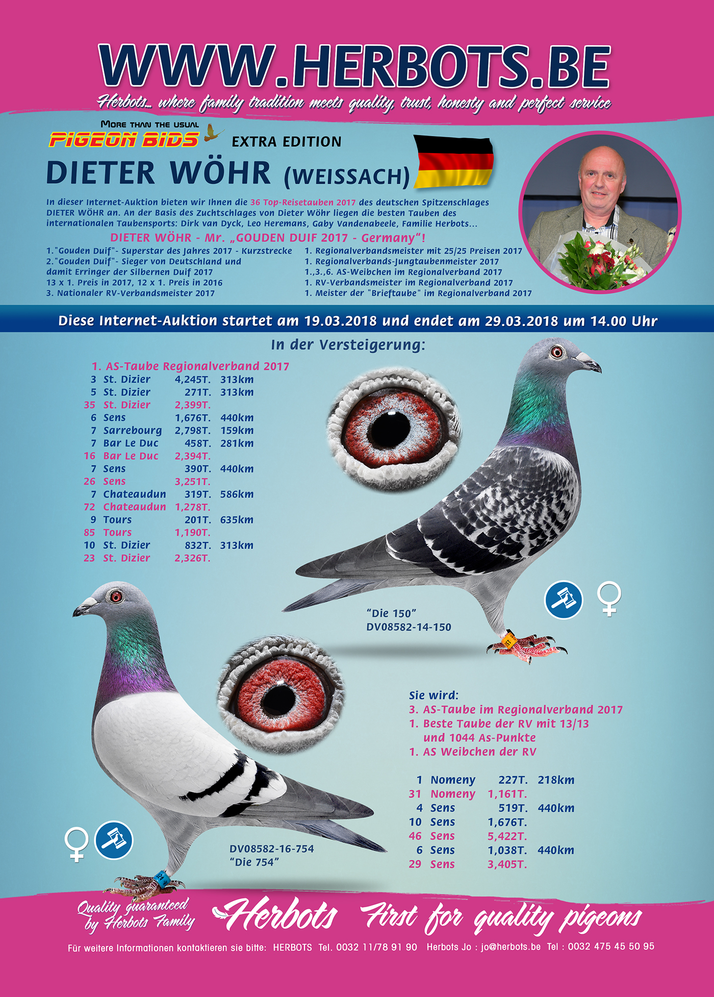 vom 19. März 2018 bis zum 29. März 2018 läuft eine aussergewöhnliche Auktion von Dieter Wöhr als Pigeon Bids Extra Edition auf www.herbots.be…(click)