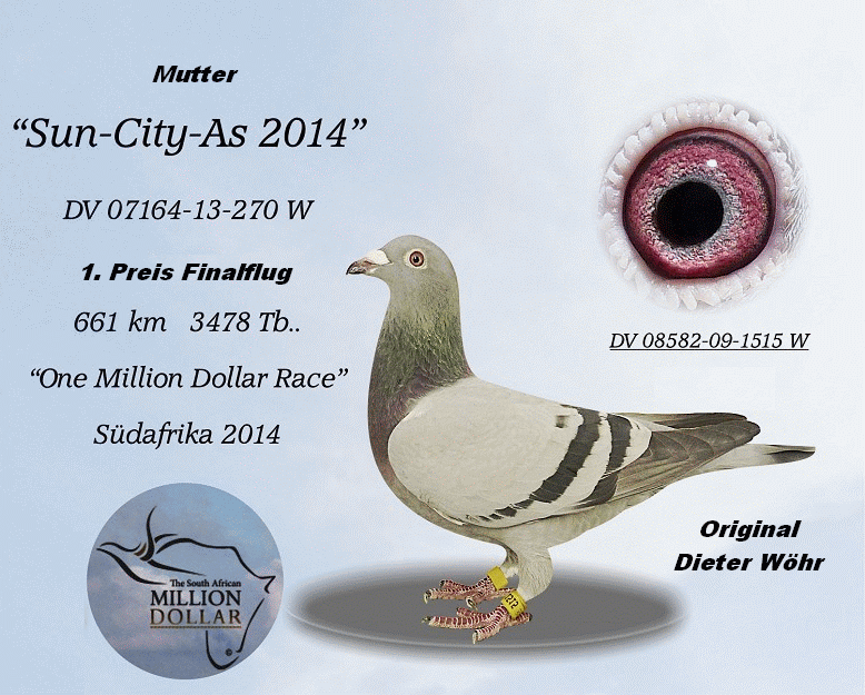 Der Sieger beim Endflug in Sun-City 2014 vom leider zu früh verstorbenen Karl Ziefle, wurde aus einer Original-Taube von Dieter Wöhr gezüchtet. Die Mutter 08582-09-1515 kommt aus einem Sohn des „DI CAPRIO“ der mit einer Tochter des AS-Vogel „777“, einem Sohn des Top-Vererber „244“, verpaart war.
