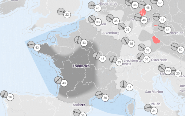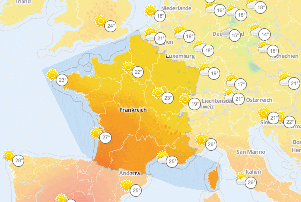 Es werden Höchsttemperaturen von 30° (gefühlt: 27°) und frischer Wind (28 km/h) aus Nordnordwest mit steifen Böen (57 km/h) erwartet. Es kommt zu Niederschlagsmengen von ≤ 0,5 l/m², die Niederschlagswahrscheinlichkeit beträgt 20%, die Sonne scheint 11 Stunden.