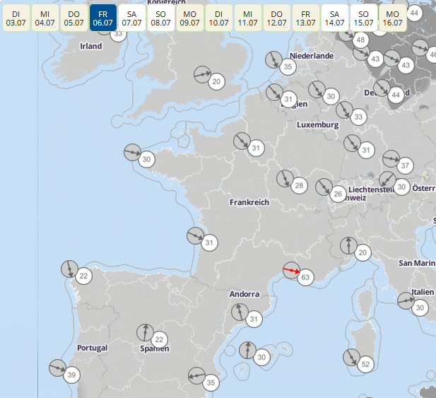 In Barcelona ist es beinahe windstill aus Nordosten. Auf der Strecke weht der Wind aus unterschiedlichen Richtungen jedoch überwiegend aus Nordosten. Der Wind frischt im Norden Frankreichs auf 25 km/h auf. Die Temperaturen steigen auf ca. 28 Grad C. Beim Auflass war es ca. 20 Grad C. Die Tauben sind schnell abgezogen.