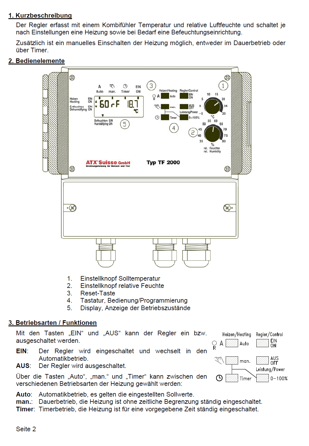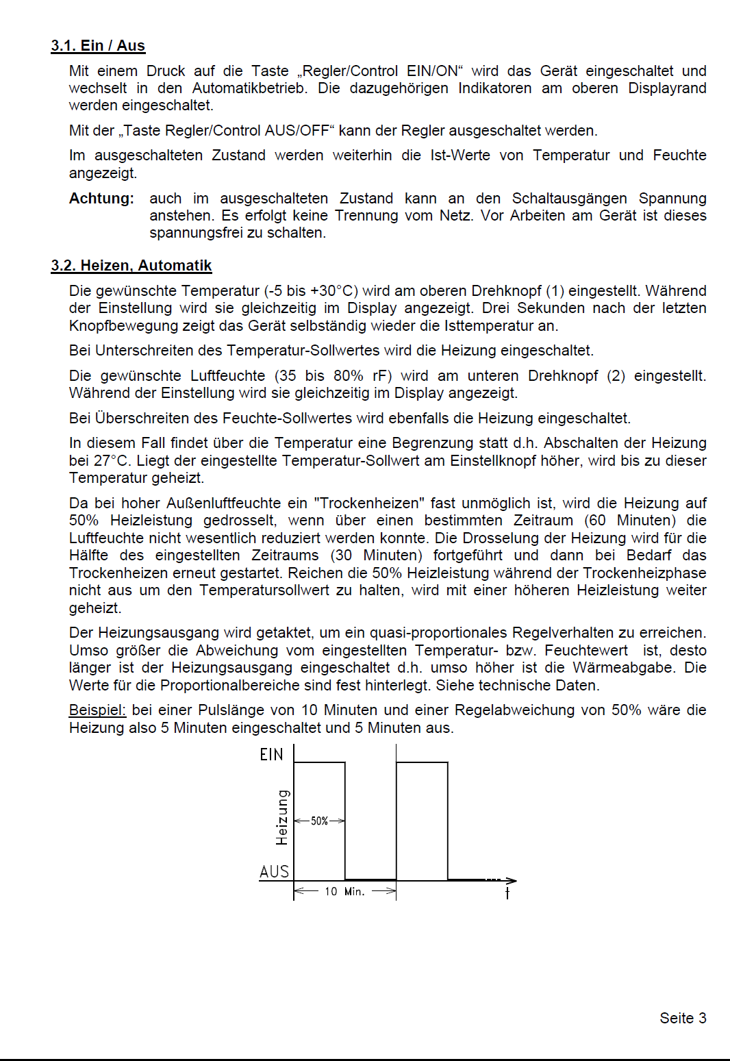 Einfachste Regelung mit Hygrostat (Luftfeuchtigkeit) und Thermostat, oder dem komfortablen digitalen Regler mit automatischer Energiesparfunktion.