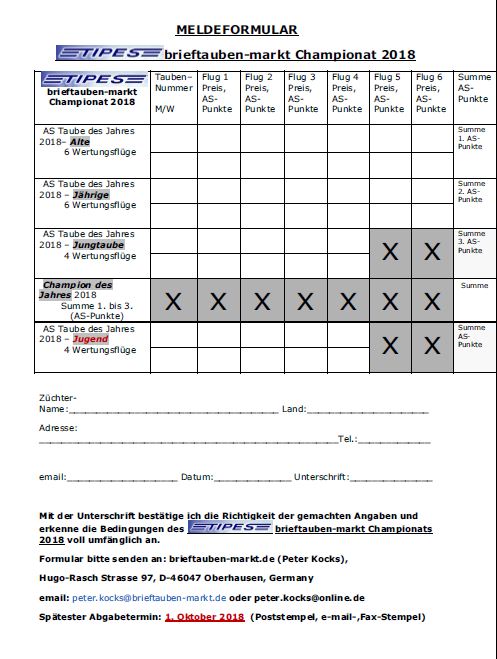 brieftauben-markt Championat 2018“ werden auf dem Internetportal www.brieftauben-markt.de und in der Zeitschrift TaubenMarkt/Die Sporttaube veröffentlicht.