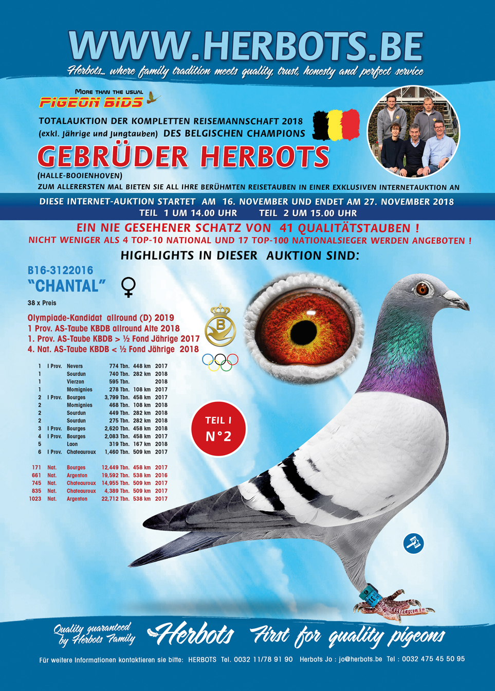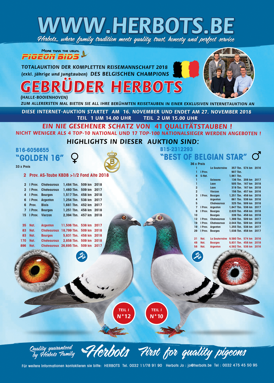 TOTALAUKTION DER KOMPLETTEN REISEMANNSCHAFT 2018 (exkl. Jährige und Jungtauben) DES BELGISCHEN CHAMPIONS GEBRÜDER HERBOTS.