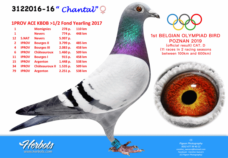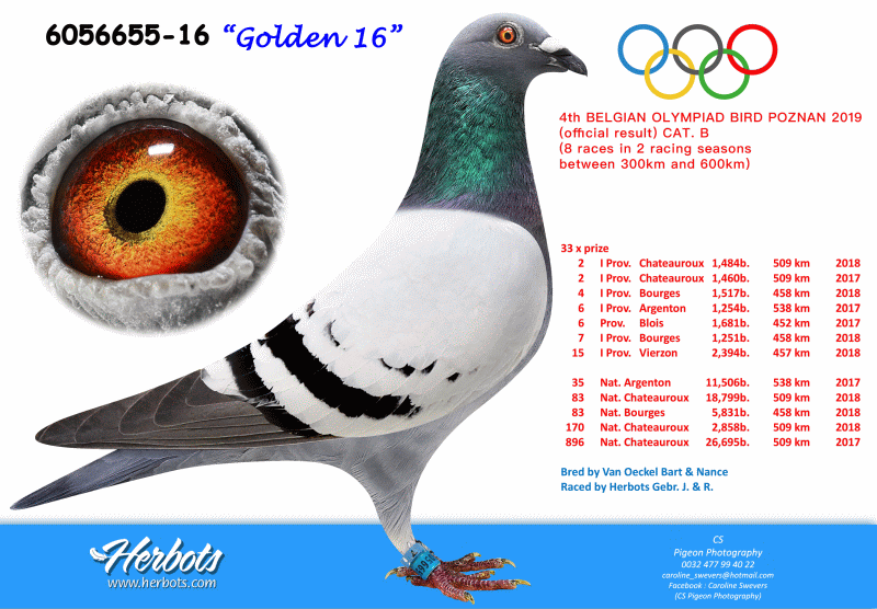 Die beiden jährigen Tauben BE2140082-17 10. Platz und BE2140386-17 17. Platz beide in der Kategorie G (5 Füge > 300 Km in 1 Jahr) vervollständigen die aktuelle Olympiade-Mannschaft der Familie Herbots.