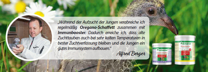 Die Qualität der Jungtauben wird direkt durch die optimale Ernährung beeinflusst. Entscheidend ist in der Zucht, dass sich das vorhandene Leistungspotential auch uneingeschränkt entwickeln kann. Deswegen darf man nicht allein in beste und gesunde Elterntiere investieren, sondern sollte auch für eine optimale, lückenlose Ernährung der Zuchttiere sorgen. Mit dem folgenden Fütterungskonzept überlassen Sie nichts dem Zufall. Bestens entwickelte Jungtauben sind das Ergebnis dieser Bemühungen. Das Fütterungskonzept verfolgt einen reduzierten Gehalt an den schwer verdaulichen Erbsen und enthält dafür vermehrt die hochwertigen und leicht verdaulichen getoasteten Sojabohnen, sowie Sämereien wie z. B. Hanf, die wiederum reich an den wertvollen Linol- und Linolensäuren sind.