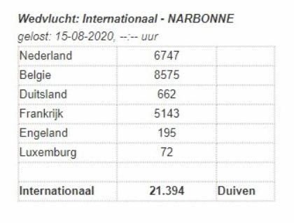 Es wurden international 21.394 Tauben eingekorbt. Im Jahr 2019 waren es 18.094 Tauben.