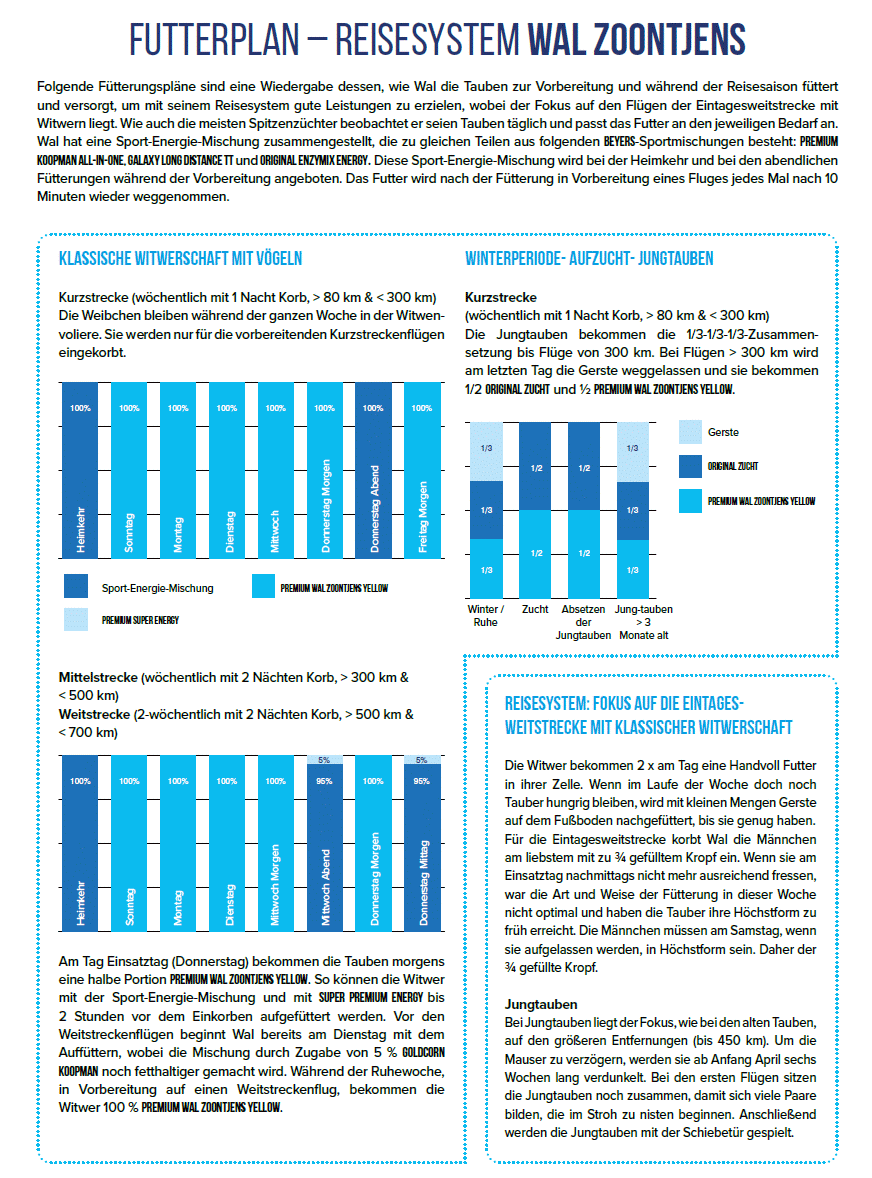 Gleich nachdem Wal Zoontjens 1968 völlig selbstständig begann, mit Tauben in Riel (NL) zu spielen, hat er immer zu den Siegern gehört. Bereits in den 30er Jahren des vorigen Jahrhunderts war sein Vater Jan Zoontjens auf der Suche nach besseren Versorgungsmethoden. Seine Richtschnur war das Buch ‘Futter, Vitamine und Tauben’ von Arie van den Hoek. Dadurch kam er auf die Idee, die damals erhältlichen Handelsmischungen zu sieben. Die kleinen Körner gab er zu Beginn der Woche und das gröbere Futter, bestehend aus verschiedenen Maissorten und Hülsenfrüchten, während der letzten Tage vor dem Einsetzen.