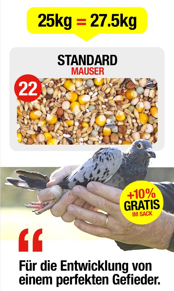 Damit bei der Mauser nichts schief geht. Die perfekten Mausermischungen von VANROBAEYS in der Mauseraktion 2025. Bei ihrem Fachhändler jetzt verfügbar.