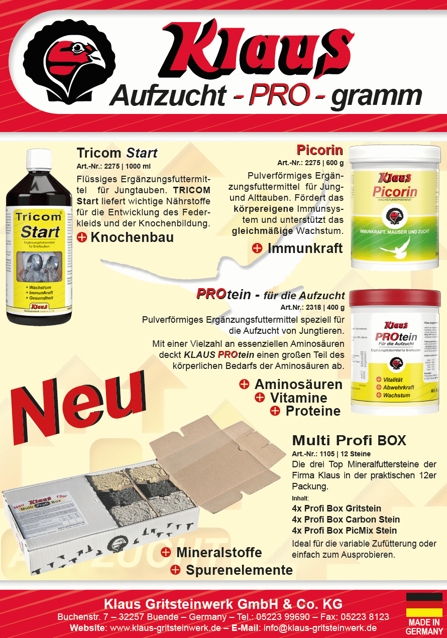 Amino Prime, Superkraft-GeNies Pulver, Superkraft – Amino E, B12 +C, Silberpfeil Reise 1, Reise 2, Reise 1 Kapseln, Zuchtkapseln, Pixo Tabletten, Sedochol, Tricom-Mauserhilfe, Klaus-CTP.