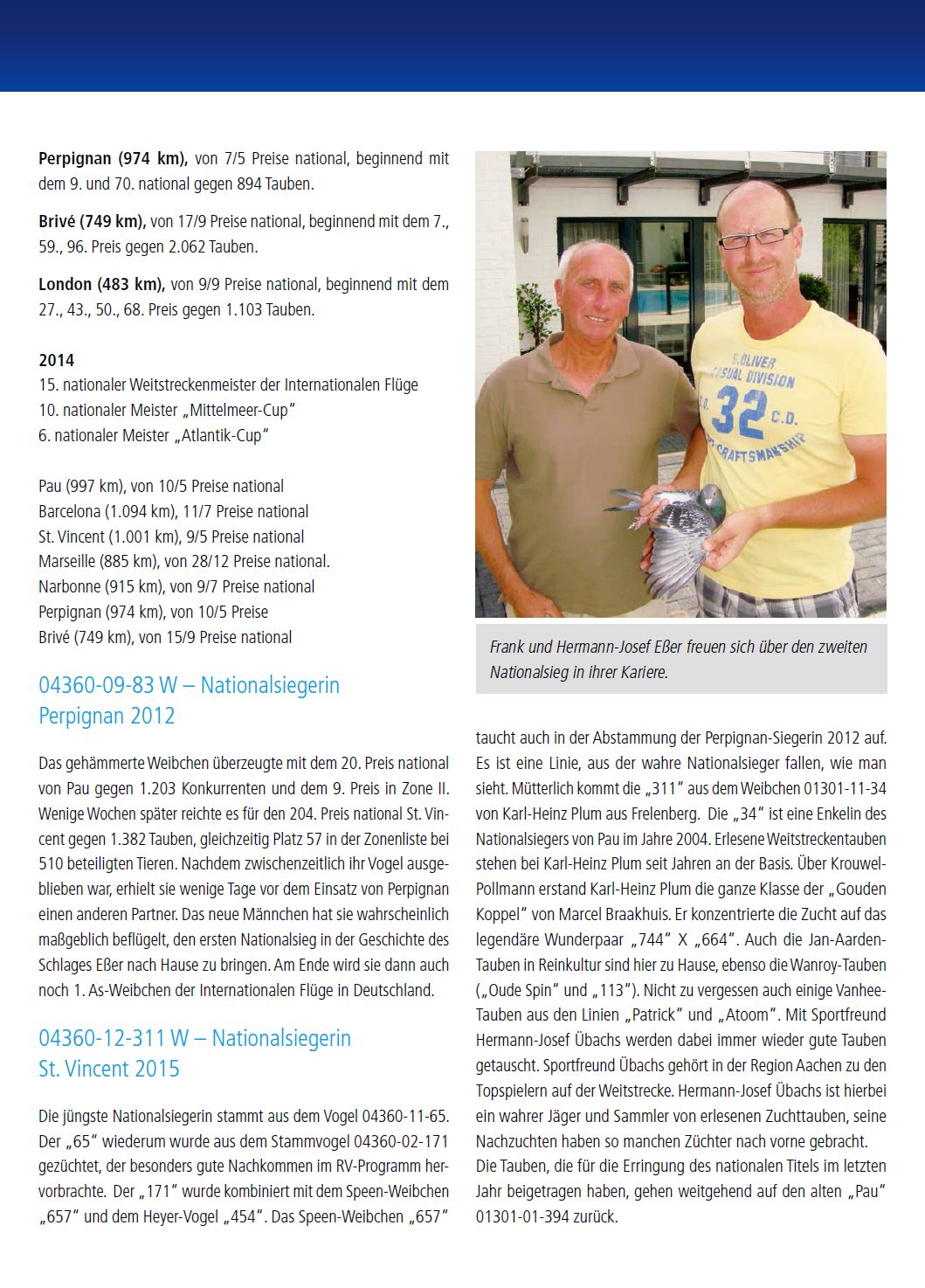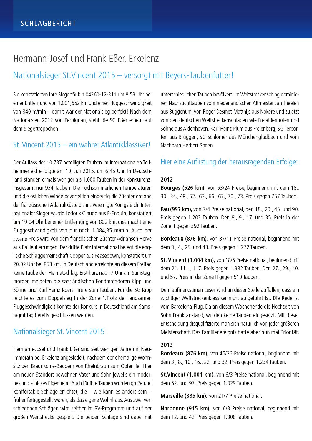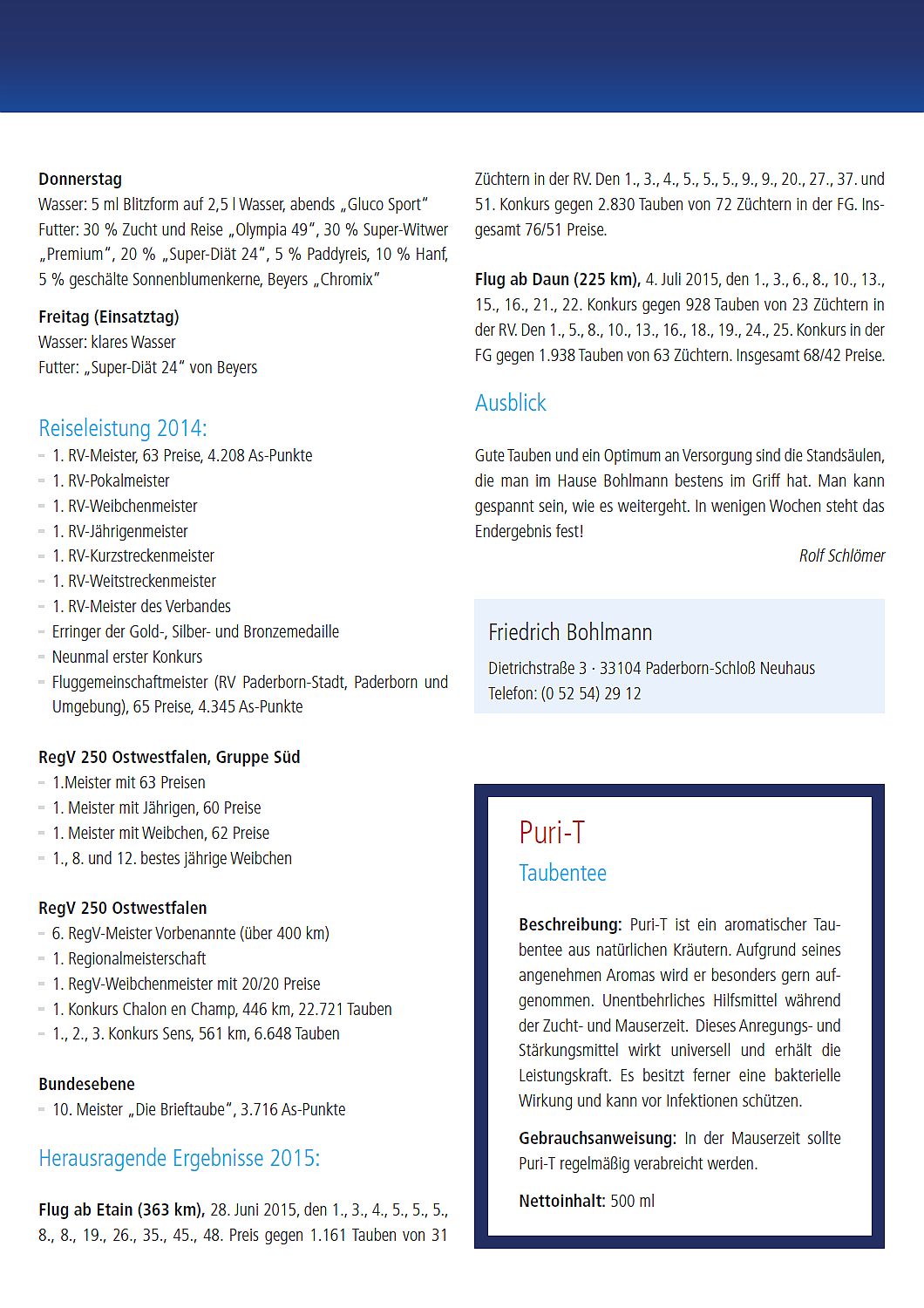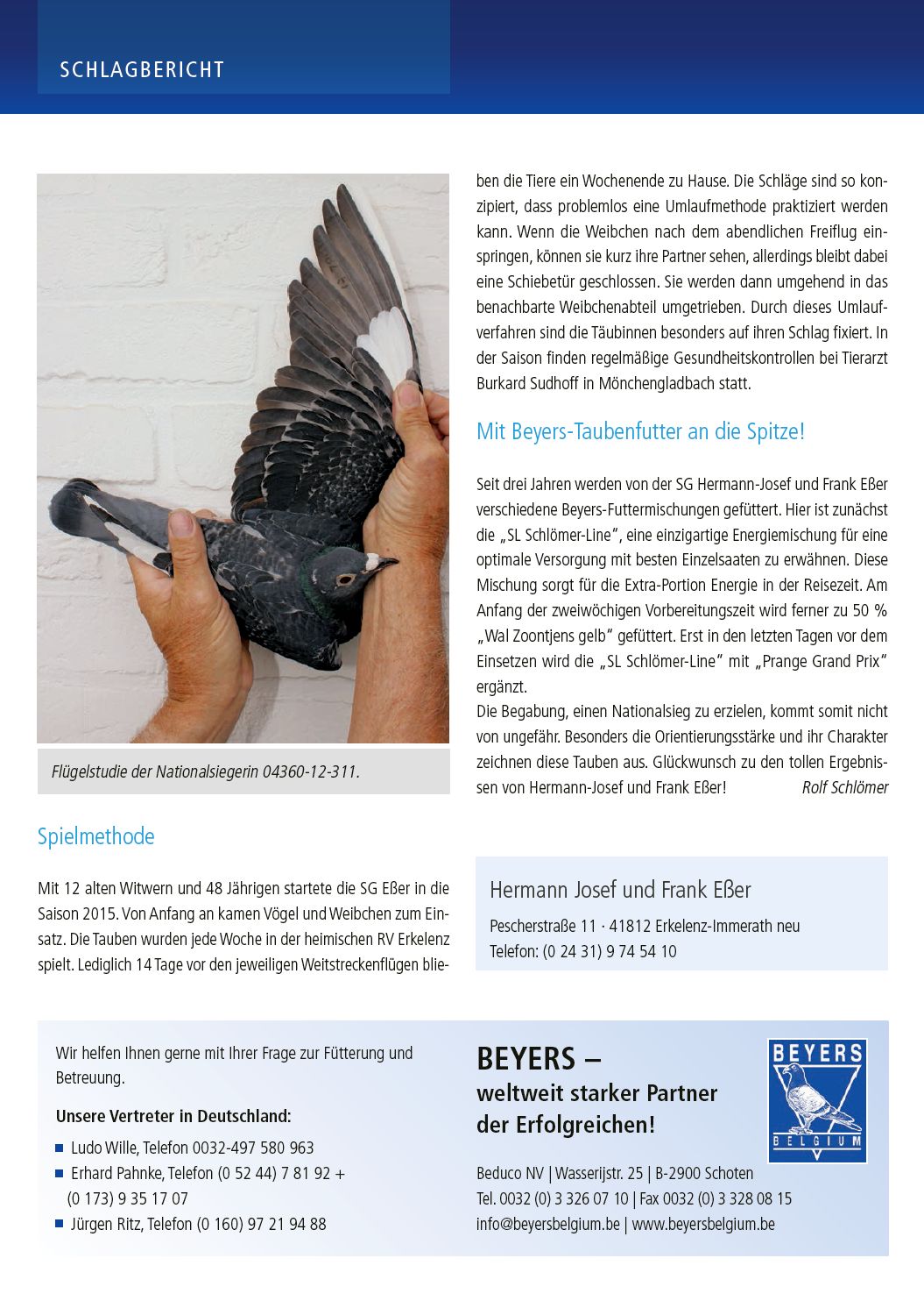 Was sich in der Saison 2015 abzeichnete, stellt vergangenes ohne Übertreibung in den Schatten. Unzählige Erfolgsmeldungen haben uns wieder erreicht. Mit Beyers-Taubenfutter und den Ergänzungsfuttermitteln erreichte man eine sehr große Zufriedenheit. Perfektionierung und Optimierung sind hier die entscheidende Grundlage.