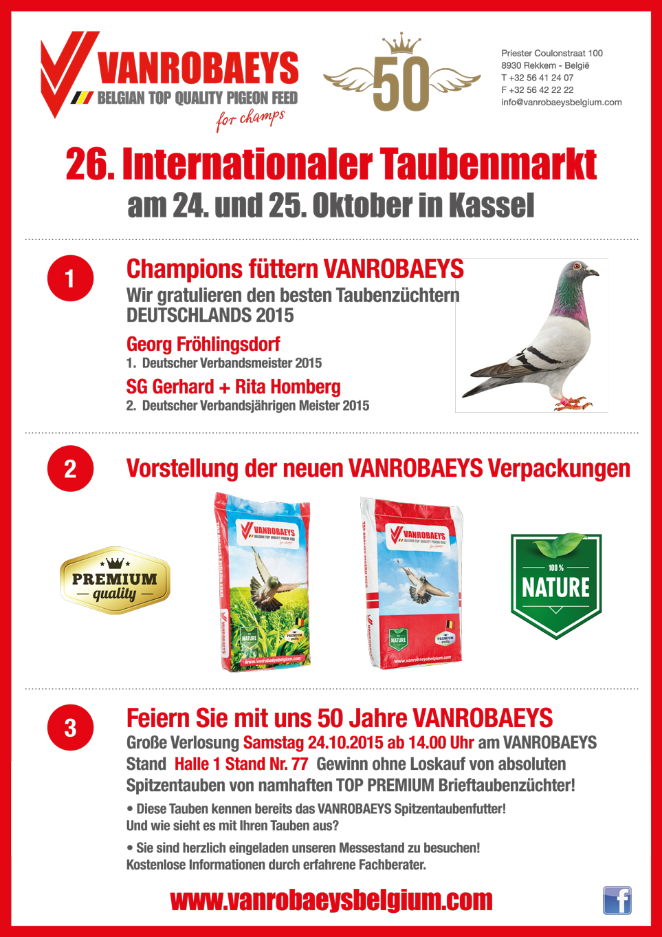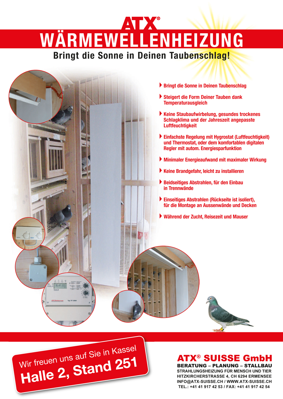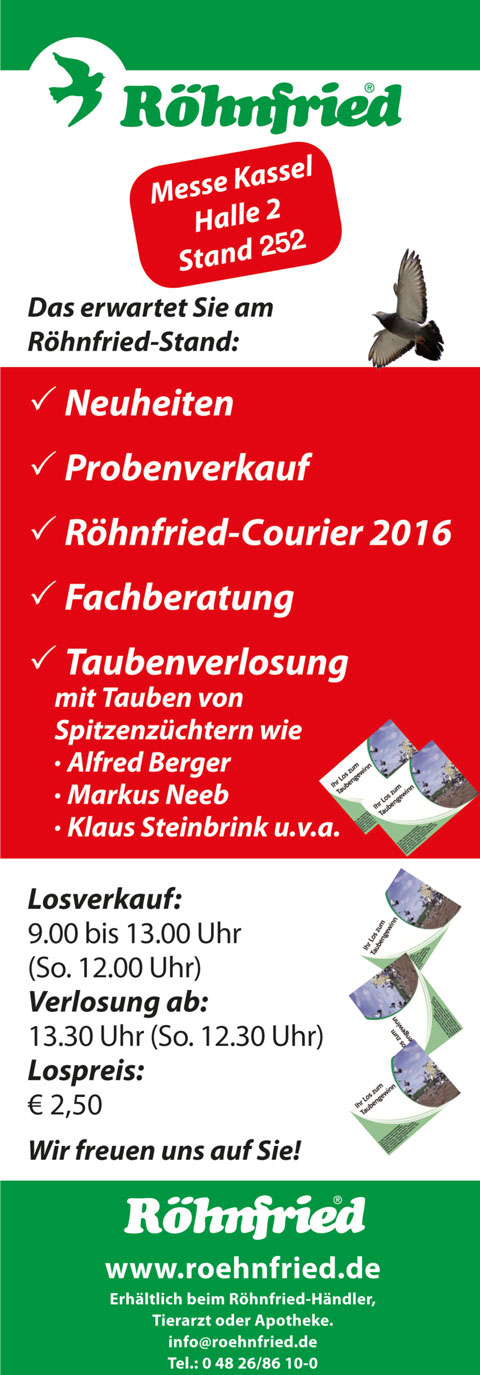 Des weiteren möchte ich noch darauf hinweisen, dass während des Int. TaubenMarkt in den Messehallen Kassel nicht nur gekauft und verkauft wird. Ein ganztägiges Unterhaltungsprogramm an beiden Messetagen, Siegerehrungen beliebter überregionaler Meisterschaften sowie weitere Events bieten etwas zu sehen, zu hören und mit zu machen – also – herzlich willkommen – freuen Sie sich auf Kassel!