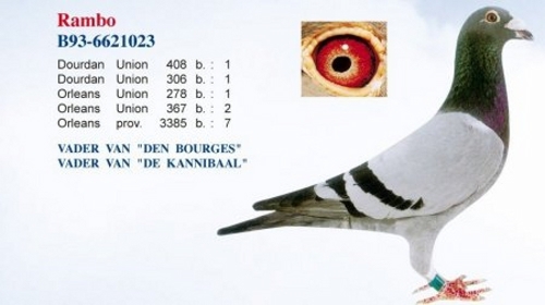 Denisse und Frans Van Beirendonck. Bis 1993 spielten sie nur Quiévrain (auch heute noch nimmt Dirk jede Woche an diesen beliebten Flügen teil, es ist von Vorteil, dass sie bis zu 3-mal in der Woche in Antwerpen stattfinden). 1993 dann gab es den Basisvogel, den Rambo B 93-6621023, als Jähriger gewann er 3 x 1. in der Union Antwerpen und als Zuchttaube war er Gold wert.