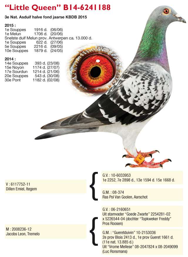 Op de Beeck-Baetens, Marcel Wouters, Gaston Van de Wouwer, Marina Van De Velde, Luc , Bart & Jurgen Geerinckx, Leon Van Den Brandt, Marcel & Gunther Vercammen, Jos Vercammen und Leo Heremans, wo die Spitzenzuchttaube „Di Caprio“ gekauft wurde – Vater des Olympic Niels B 08-6338005, 3. Olympia-Taube Kat. A Nitra 2013, und von Nationalsiegern.