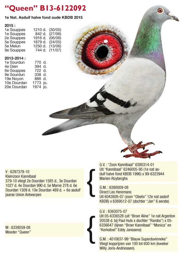 Er wurde der Vater von B 94-6323005, dem Bourges, der 2. National Bourges gegen 40.401 Jungtauben und davor 54. Provinzial Orléans gegen 12.570 Jungtauben wurde. Ein Jahr später wurde der B95-6246005 oder Kannibaal geboren, ein Spitzenvogel mit 1. National As Mittelstrecke KBDB (1. Marne gegen 856 Tauben, 1. Dourdan gegen 727 Tauben, 1. Dourdan gegen 694 Tauben, 1. Noyon gegen 157 Tauben, 3. Dourdan gegen 1.060 Tauben, 7. Orléans gegen 5.140 Tauben, 7. Dourdan gegen 1.004 Tauben). Ab diesem Zeitpunkt wurde der Bestand um diese 3 Spitzenztauben herum aufgebaut, deren Nachkommen man heute überall in der Welt findet. Das Geschichte von „Van Dyck – Kannibaal“ war geboren!