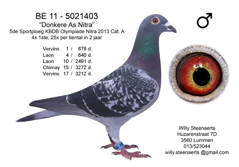 Wer alle Flüge von 100 bis 600 km erfolgreich spielen möchte, sollte schon über eine ausreichende, aber auch eine Mannschaft verfügen welche über hohe Qualitäten verfügt. Gerade die deutschen Züchter wissen diese Allround Qualitäten zu schätzen. Haben sich die meisten belgischen Taubenzüchter auf die Kurz-, Mittel- oder auch Weitstrecke spezialisiert, so spielt Willy Steenaerts alles, was die belgischen Reiseprogramme zu bieten haben. Und dies mit Ergebnissen auf allen Entfernungen und allen Konkurrenzen, die seine Gegner erschrecken aber auch voller Bewunderung sein lassen. In 2015 wurde nicht weniger als 26 x der 1. Preis gespielt. War es im letzten Jahr die Wundertaube „MISTER KASSEL“, die für Furore sorgte so war es in 2015 das Super-AS „De 555“, der unglaubliche Leistungen zeigte.