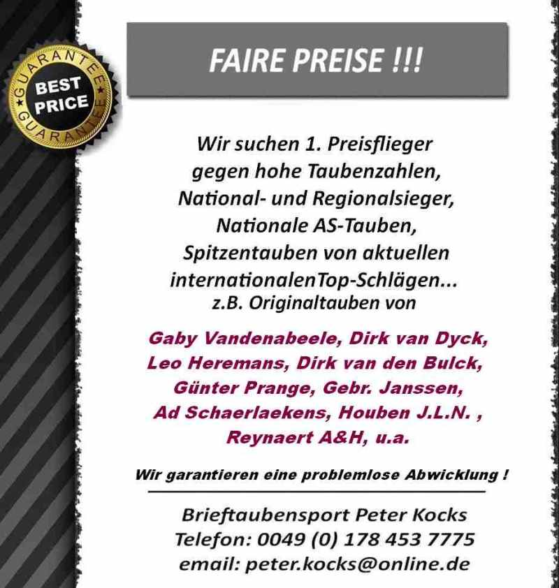 Wir haben für Sie wieder einen “bunten Blumenstrauß“ an Reportagen, Berichten und Fachbeiträgen zusammen gestellt. Es beginnt mit den Weitstreckenassen und deren Besitzern – eine international renommierte Schlaggemeinschaft. Hinzu kommen Berichte über Siegerehrungen der Weitstrecken-Freunde aus Mitteldeutschland sowie drei weitere Reportagen über Weitstreckenfreunde in den Niederlanden. Selbstverständlich ist auch die Deutsche Brieftaubenausstellung vertreten. Und ein Interview mit dem Sportfreund, der dort im gleichen Jahr den Standardvogel und das Standardweibchen stellt – ein wohl einmaliger Erfolg. Des weiteren werden in dieser Ausgabe auf unserer “Österreich-Seite“ Sportfreunde von dort präsentiert, die besonders gut auf den internationalen Tribünenflüge abgeschnitten haben – durchaus interessante Ausführungen. Eine Reportage aus Belgien darf natürlich auch nicht fehlen. Und selbstverständlich die monatlichen Reportagen über besonders erfolgreiche deutsche Sportfreunde. Abgerundet wird die aktuelle Berichterstattung dann mit Beiträgen über Nationalsieger und Siegerehrungen in Regionalverbänden. Die gewohnten Seiten über “Gesundheit für die Tauben“ von Tierarzt Rene Becker sowie “Aus der Wissenschaft“ von Apotheker Otto Wack werden auch nicht übersehen. Und dann die Veröffentlichungen, die vielleicht nicht ganz brandaktuell sind, doch von zahllosen Lesern immer wieder gewünscht werden. Dazu gehören die Beiträge “Aus der Geschichte“ (des Taubensports natürlich) und “Damals wie heute gültig.“ Für die Experten dann die “Pikanterie des Monats“ und der Fortsetzungsroman “Der Wormersdorfer Schimanski“ – viel Spaß beim Lesen und „Freiheit im Taubensport“!