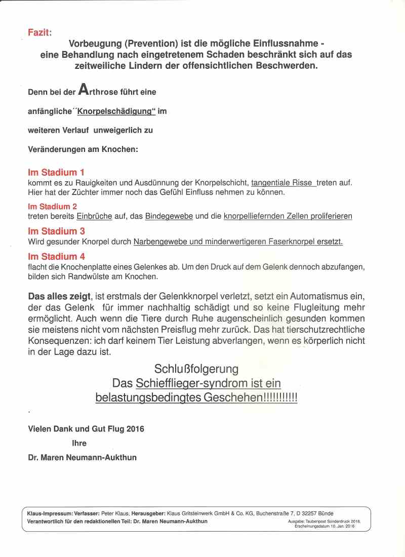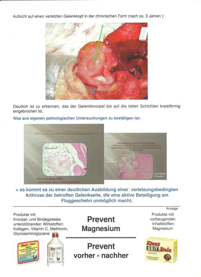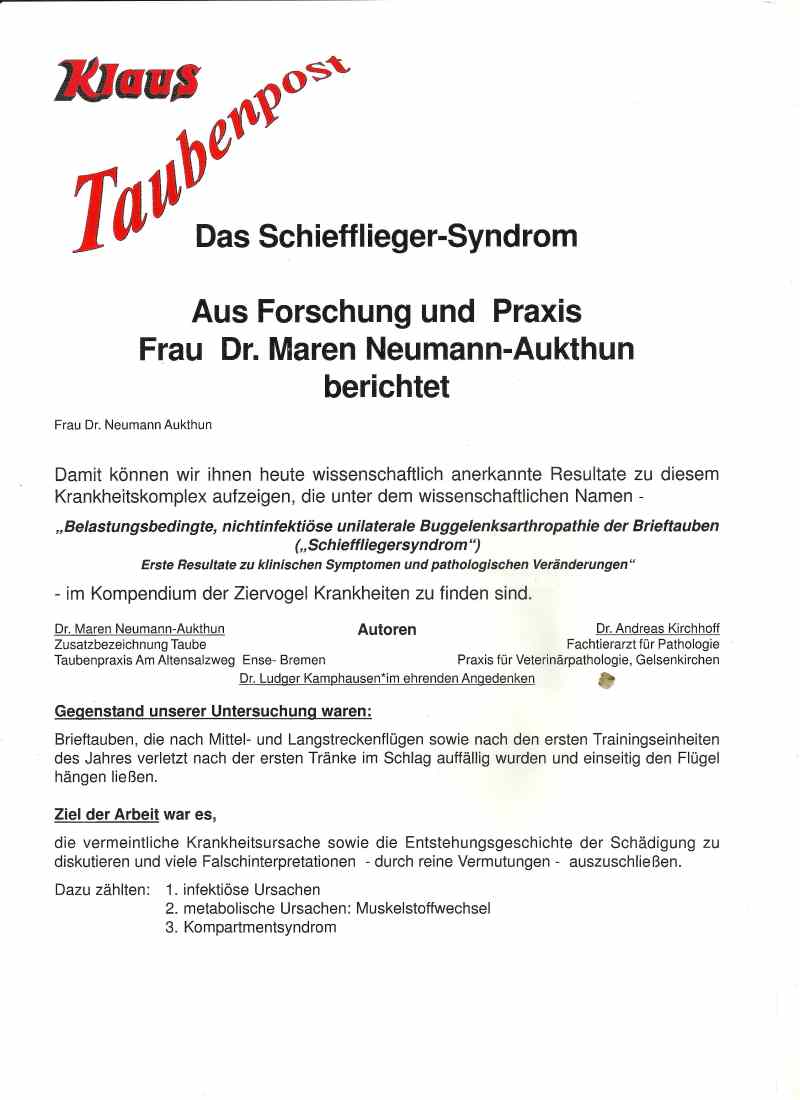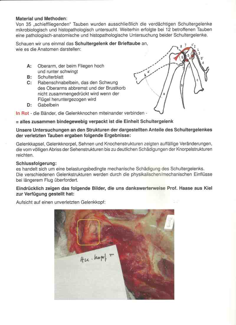 Wir können ihnen heute wissenschaftlich anerkannte Resultate zu diesem Krankheitskomplex aufzeigen, die unter dem Namen „Belastungsbedingte, nicht infektiöse unilaterale Buggelenksarthropathie der Brieftauben (Schieffliegersyndrom) erste Resultate zu klinischen Symptomen und pathologische Veränderungen“ bekannt sind.