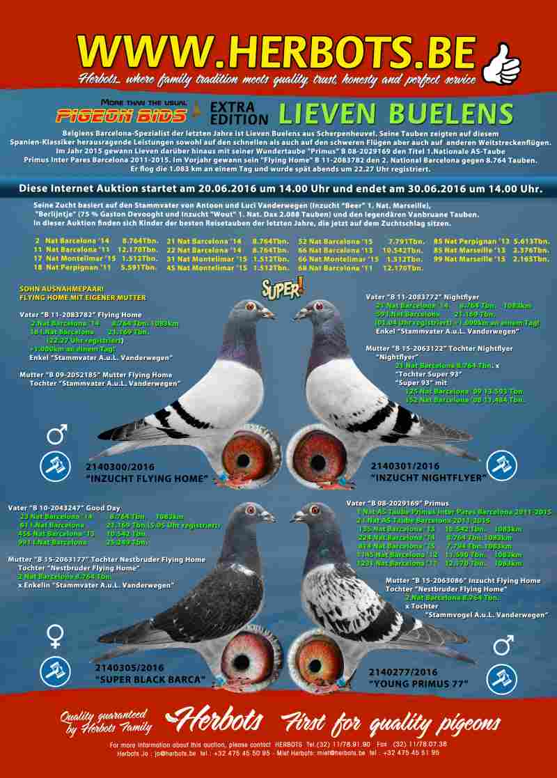 Belgiens Barcelona-Spezialist der letzten Jahre ist Lieven Buelens aus Scherpenheuvel. Seine Tauben zeigten auf diesem Spanien-Klassiker herausragende Leistungen sowohl auf den schnellen als auch auf den schweren Flügen aber auch auf anderen Weitstreckenflügen. Im Jahr 2015 gewann Lieven darüber hinaus mit seiner Wundertaube „Primus“ B 08-2029169 den Titel 1.Nationale AS-Taube Primus Inter Pares Barcelona 2011-2015. Im Vorjahr gewann sein „Flying Home“ B 11-2083782 den 2. National Barcelona gegen 8.764 Tauben. Er flog die 1.083 km an einem Tag und wurde spät abends um 22.27 Uhr registriert.