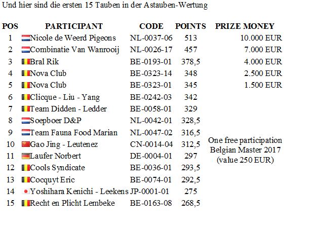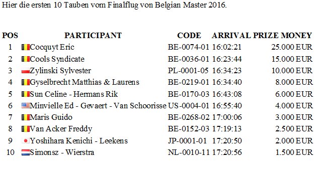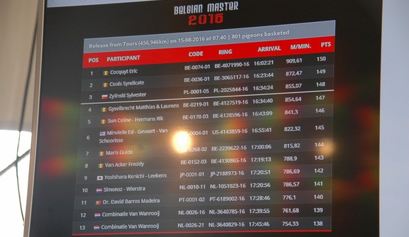 Die Siegertaube BE16-4071990 von Eric Cocquyt aus Vinkt (B) war der Gewinner des zum 9. Mal stattfindenden Belgian Master 2016. Um 16.02.21 Uhr wurde die Taube registriert. Bei einer Entfernung von 456,946 km ergibt sich eine Fluggeschwindigkeit von 909,61 Meter/Min.