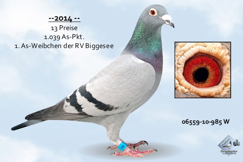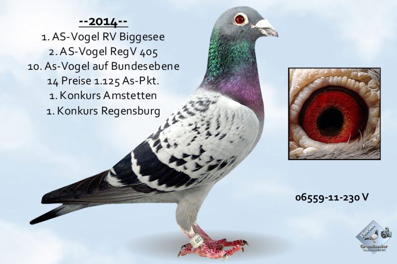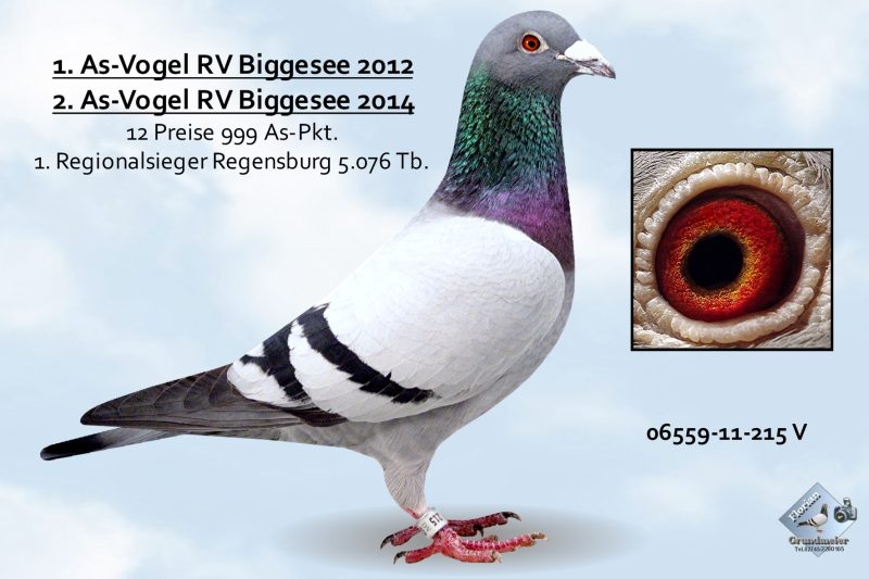 Ein weiterer Spitzenflieger, der hier erwähnt werden muss, ist der 06559-13-681 „Porsche 681“. Er war 1. As-Vogel in der RegV-Gruppe 2 und 1. Regionalflugsieger 2015 ab Altdorf. Seine Spitzenpreise u.a.: 1. Preis gegen 2368 Tauben, 4. Preis gegen 4615 Tauben, 5. Preis gegen 1575 Tauben, 9. Preis gegen 6121 Tauben, 14. Preis gegen 2466 Tauben, 17. Preis gegen 1970 Tauben, 18. Preis gegen 2382 Tauben usw. Ein Jahr zuvor gewann er einen 1. Preis ab Regensburg, einen 2. Preis ab Neumarkt, jeweils einen 8. Preis ab Weibersbrunn und Erlangen.