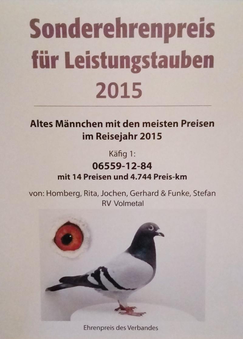 Seit Jahren hat sich die Schlaggemeinschaft Gerhard und Rita Homberg zum wahren „Überflieger“ entwickelt. Neben der Erringung von verschiedenen Titeln auf Regionalverbandsebene, sind es die unzähligen Spitzenpreise und erste Konkurse, die diesen Schlag ins Rampenlicht rücken. Darunter zählen auch Regionalflugsiege gegen hohe Taubenzahlen. Nach den spektakulären Ergebnissen in den vergangenen Jahren, knüpfte die Schlaggemeinschaft in der Saison 2015 nahtlos an das Leistungsniveau an und krönt den Abschluss mit der Verbandsvizemeisterschaft bei den Jährigen. Bisher wurden acht Plätze unter den Top Ten bei den Verbandsmeisterschaften auf Bundesebene gewonnen. Im Jahre 2004 wurde man zuletzt 2. Verbandsmeister.